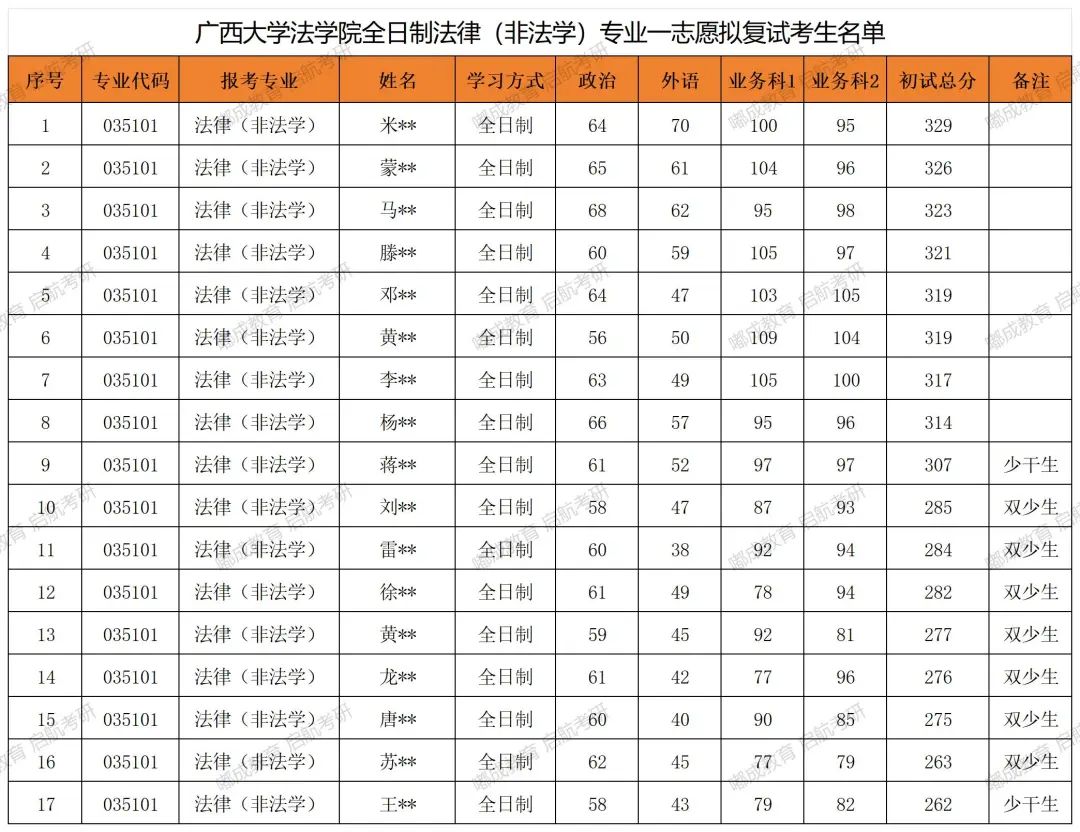备注说明:文章数据由广西启航考研整理自广西大学研究生院及法学院官网。仅供学习分享,传递积极能量,如有误差/侵权,请联系本公众号进行修改与删除,谢谢!