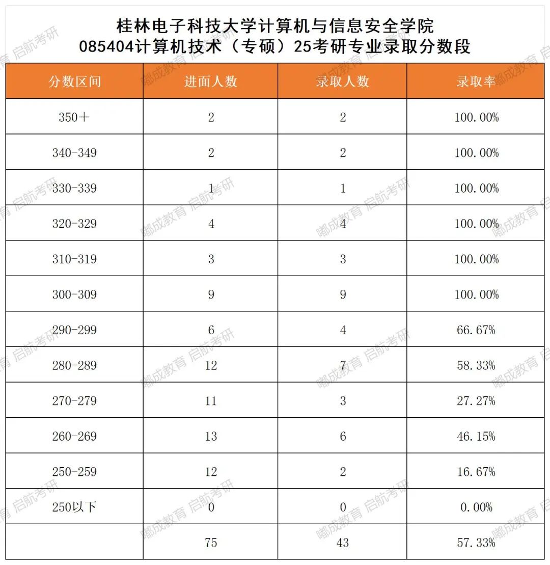 桂林电子科技大学计算机与信息安全学院全日制计算机技术专业25考研一志愿继续爆满,复试差额比例达到了1:1.74,说明竞争还是蛮激烈的,录取考生中250-260分数区间的仅录取2人,280分以下的录取率均不高,300分以上的全部录取,说明低分段考生复试压力会比较大,另外该专业方向未有少数民族照顾政策考生进面,说明双少生政策在热门专业中比较难争取到,想要一志愿报考该院校该专业的同学,目标分建议定到300+