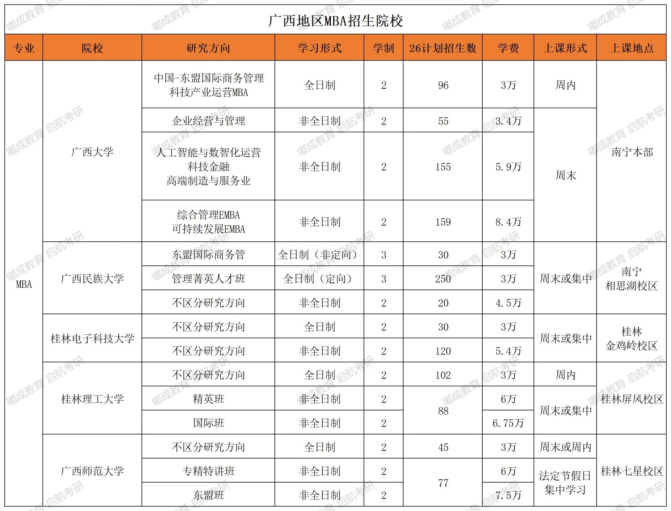 广西地区工商管理硕士(MBA)26考研各院校招生情况