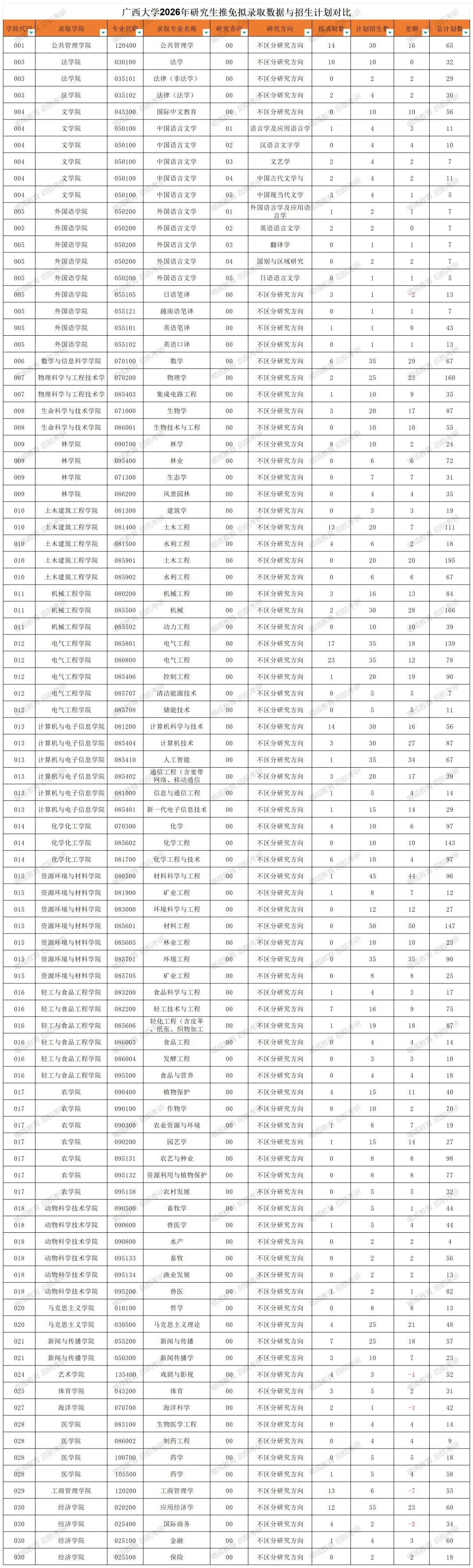 广西大学2026年研究生推免拟录取数据与招生计划对比
